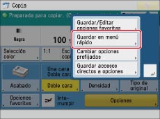 Si guarda las opciones de funciones que utiliza con más frecuencia, como Copia, Leer y enviar, y Leer y guardar, en el menú rápido, también podrá utilizar las opciones guardadas en otro equipo.