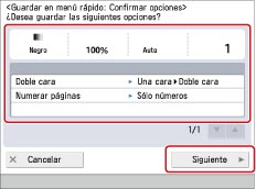 Guardar las opciones para copiar un documento a una cara en ambas caras del papel y agregar números de página