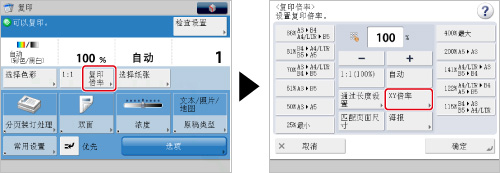 如果设置[自动XY倍率],则使用“手动纸张选择”模式选择纸张尺寸。如果没有选择纸张尺寸,则会自动选择“纸盒1”并根据“纸盒1”中添加的纸张尺寸设置复印倍率。