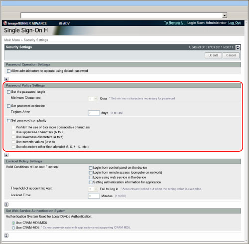 密码限制设置只有对在限制设置完成后注册/编辑的密码才生效。已注册的密码超出限制时,执行用户认证时会显示提示更改密码的屏幕。