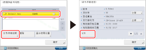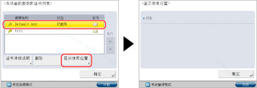 由于IEEE802.1X认证/IPSec正在使用密钥对或由于SSL设置为“打开”,因此不能删除在<状态>中显示为“已使用”的密钥对。按[显示使用位置]检查使用该密钥对的安全性类型。要仅删除SSL使用的密钥对,将以下设置设为“关闭”。无法删除正在用于IEEE802.1X认证/IPSec的密钥对。