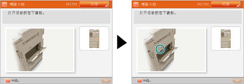 如果在多个位置发生卡纸,按照触摸面板显示屏幕所示的顺序清除卡纸。