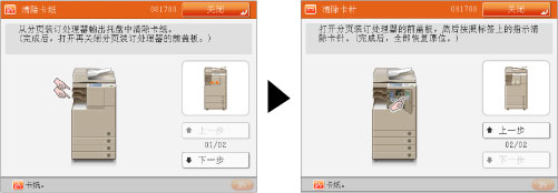 如果发生卡针,触摸面板显示屏幕上会显示指示卡针位置和如何清除卡针的屏幕。按照屏幕上的说明清除卡针。此屏幕将反复显示,直到清除卡针。如果按[关闭],即使没有立即清除卡针,也可以继续操作,例如设置模式或扫描原稿。