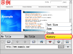 如果将“Settings”(设置)中的[Rstrct History Display](限制历史记录显示)设置为“On”(打开),则无法显示URL历史记录。(See "隐私策略和规则设置.")