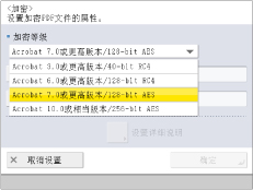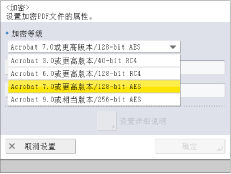 如果选择[Acrobat 10.0或相当版本],选择加密等级时就会显示[Acrobat 10.0或相当版本/256-bit AES]。