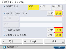 为<SMTP认证(SMTP AUTH)>按[关闭]→为<发送前POP认证>按[关闭]。