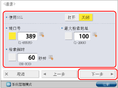 如果为<认证信息>选择[使用(安全认证)],而“设置/注册”的[参数选择]中的[日期/时间设置]与LDAP服务器上的时间设置不同,则本机可能无法连接到LDAP服务器。