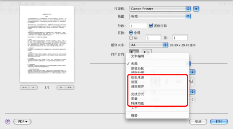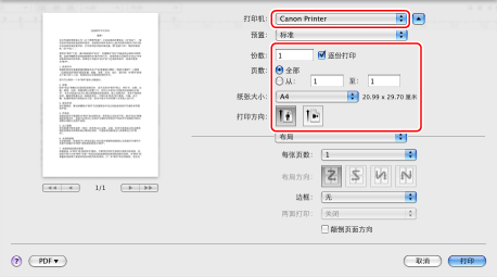 在Mac OS X 10.5或更高版本中,根据所使用的应用程序,可能不显示[页面设置]对话框。如果是这种情况,跳过步骤4。可以在[打印]对话框中指定[纸张大小]、[打印方向]和[缩放]。