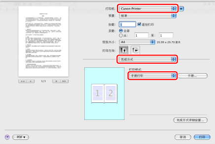 选择打印机→[完成方式]→从[打印样式]选择[手册打印]。