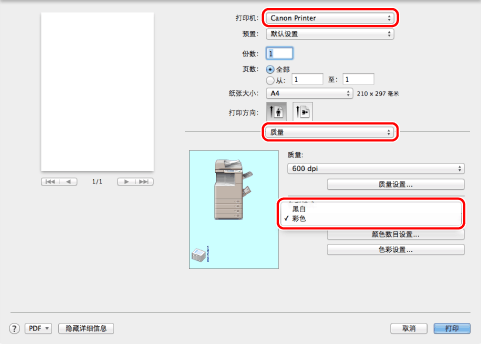 选择打印机→ [质量] → [色彩模式]中的[黑白]或[彩色]。