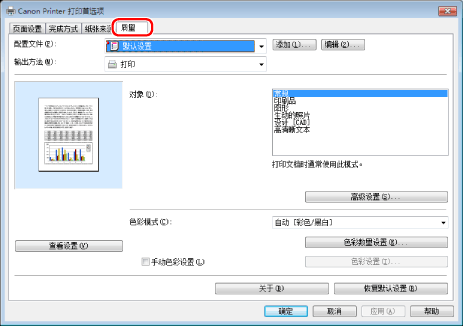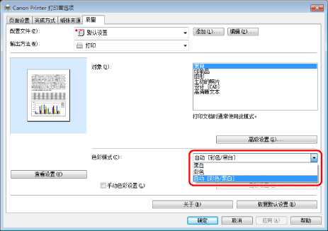 根据数据的类型,[自动[彩色/黑白]]自动在彩色打印和黑白打印之间切换。