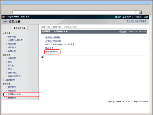 按[管理设置]→[许可协议/其他]→[注册/更新软件]。