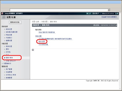 访问“远程用户界面”→单击[设置/注册]→[接收/转发]→[转发设置]。
