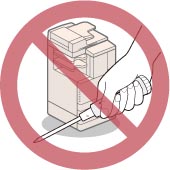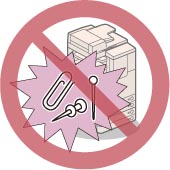 请小心不要让液体溅入本机或让任何异物(如纸夹或装订针)掉入本机内。如果异物与本机内的电气部件接触,可能会引起短路并且导致火灾或触电事故。