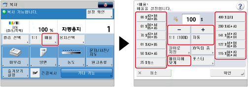 [자동]으로 설정한 경우 용지 크기를 수동으로 선택해야 합니다. 용지 크기를 선택하지 않으면 복사 배율은 용지 카세트 1에 들어 있는 용지 크기에 맞게 자동으로 설정됩니다.
