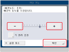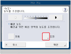 <배경 농도>로 [조정]을 눌러 배경 농도를 조정할 경우 [자동] 설정이 취소됩니다. 또한, [조정]에서 수동 조정하는 동안 [자동]을 누르면 조정이 취소됩니다. 기기에서 배경에 맞게 농도를 자동으로 조정합니다.