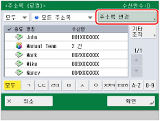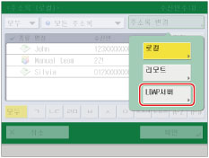 [주소록 변경]은 리모트 주소록 및 LDAP 서버를 둘 다 등록할 경우에만 나타납니다. LDAP 서버만 기기에 등록한 경우 [LDAP서버에]가 표시됩니다.
