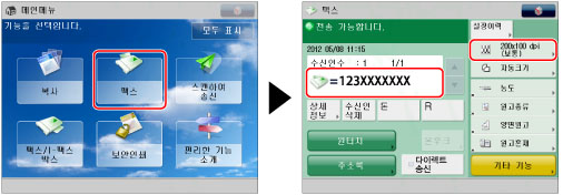 [팩스]를 누르고 → 원하는 수신인을 지정한 후 → 해상도 버튼을 누릅니다.
