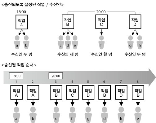 또한 예약 송신 작업 수는 예약 송신 설정이 사용되지 않은 다른 작업이 처리 중이거나 지정된 수신인에 영향을 주는 기타 요인이 있는 경우 감소될 수 있습니다.
