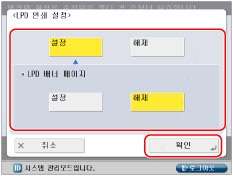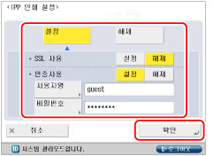 IPP 인증 기능을 사용하려면 <인증사용>에서 [설정]을 누릅니다. [사용자명]을 누르고 → IPP 인증에 사용할 사용자 이름을 입력한 후 → [확인]을 누릅니다. [비밀번호]를 누르고 → IPP 인증에 사용할 비밀번호를 입력한 후 → [확인]을 누릅니다. 확인입력 화면에서 동일한 비밀번호를 입력하여 비밀번호를 확인하고 → [확인]을 누릅니다.