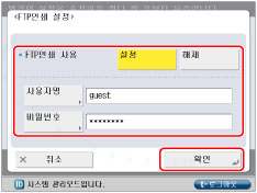비밀번호를 설정하려면 [비밀번호]를 누릅니다. FTP 서버에 로그인하는 데 필요한 비밀번호를 입력하고 → [확인]을 누릅니다. 확인입력 화면에서 동일한 비밀번호를 입력하여 비밀번호를 확인하고 → [확인]을 누릅니다.