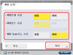 WSD 스캔 기능을 사용하려면 <WSD Scan기능 사용>에서 [설정]을 누릅니다. [HTTP 사용]은 [설정]을 선택한 경우 자동으로 '설정'으로 지정됩니다. WSD 스캔 기능에 대한 자세한 내용은