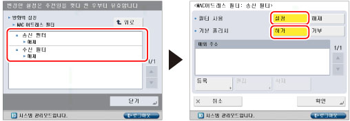 [MAC 어드레스 필터]에 대해 [송신 필터] 또는 [수신 필터] → <필터 사용>에 대해 [해제]를 누릅니다.