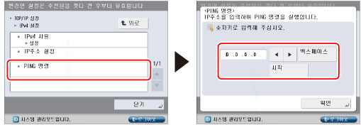 [IPv4 설정]에 대해 [PING 명령]을 누르고 → 네트워크에 있는 IPv4 주소를 입력한 후 → [시작]을 누릅니다.