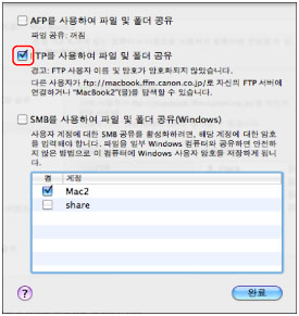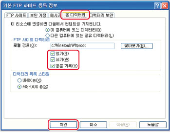 Windows XP Professional/Server 2003/Server 2008/Vista/7/Server 2008 R2를 FTP 서버로 사용하려면 IIS를 설치해야 합니다. 사용하는 컴퓨터에 IIS가 설치되어 있지 않으면 이 설정을 입력하기 전에 운영 체제에 맞는 IIS 버전을 설치해야 합니다. (See "데이터 송신.") 설치 절차에 대해서는 운영 체제에 동봉된 설명서를 참고하십시오.