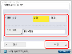 [SMB프린터 설정]을 누르고 → SMB 프린터 설정을 지정한 후 → [확인]을 누릅니다.