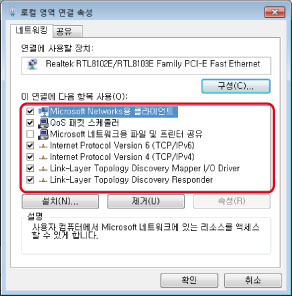 [로컬 영역 연결 속성] 대화상자에서 [Microsoft 네트워크용 클라이언트] 및 [인터넷 프로토콜(TCP/IP)]/[인터넷 프로토콜 버전 4(TCP/IPv4)]를 선택합니다.