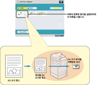 예를 들면 A3 원고를 스캔하여 A4 크기로 줄인 다음 이메일을 통해 고객에게 송신할 수 있습니다. 이 모든 작업을 버튼 하나로 수행할 수 있습니다.