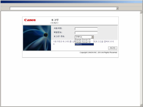사용자 인증을 허용하는 LDAP 서버의 이름이나 도메인 이름이 <로그인할 곳> 드롭다운 리스트에 표시됩니다. 그러나 로그인 대상 드롭다운 리스트에 표시된 항목에 관계없이 기기가 속한 도메인이 리스트 상단에 표시되고 [디바이스]가 리스트 하단에 표시됩니다.