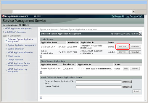 Local Device Authentication과 부문별 ID 관리를 동시에 사용하려면 로그인 서비스를 SSO-H로 전환한 후 Local Device Authentication 사용자 데이터(부문 ID와 해당 비밀번호)를 업데이트하고 [부문별 ID관리]를 '설정'으로 지정합니다.
