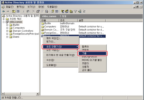 추가할 조직 구성 단위와 컨테이너를 마우스 오른쪽 버튼으로 클릭합니다.