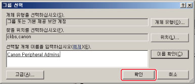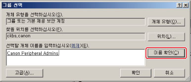 그룹 선택 대화상자에 'Canon Peripheral Admins'를 입력하고 → [이름 확인]을 클릭합니다.