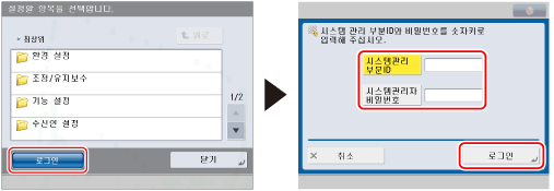 기본적으로 시스템 관리자 설정(시스템 관리 부문 ID/시스템 관리 비밀번호)이 기기에 지정되어 있습니다. 따라서 관리자는 시스템 관리 부문 ID 및 시스템 관리 비밀번호를 입력하여 로그인해야 합니다. 시스템 관리 부문 ID 및 시스템 관리 비밀번호의 기본 설정은 둘다 '7654321'입니다. 시스템 관리 부문 ID와 시스템 관리 비밀번호를 모두 변경하는 것이 좋습니다.
