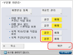 부문 ID 및 비밀번호 입력 화면이나 컨트롤 카드 삽입 화면에 [흑백복사/인쇄]를 표시하지 않으려면 <흑백복사/인쇄 작업을 허용>을 '해제'로 설정합니다.