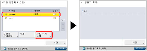 <사용상황>에 '사용중...'이 표시되는 키 페어는 IEEE802.1X 인증/IPSec에서 사용되고 있거나 SSL이 '설정'으로 지정되어 있으므로 삭제할 수 없습니다. [사용 위치 표시]를 눌러 키 페어가 현재 사용 중인 보안 종류를 확인합니다. SSL에만 사용 중인 키 페어를 삭제하려면 다음 설정을 '해제'로 설정합니다. IEEE802.1X 인증/IPSec에 사용 중인 키 페어는 삭제할 수 없습니다.