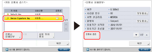 일반 사용자가 기기 증명서를 확인하는 방법에 대한 자세한 내용은 "기기 서명/사용자 서명 증명서 확인."을 참고하십시오.