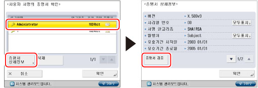일반 사용자가 사용자 증명서를 표시하는 방법에 대한 자세한 내용은 "기기 서명/사용자 서명 증명서 확인."을 참고하십시오. 그러나 이 경우 현재 로그인한 사용자에 대한 사용자 증명서만 나타납니다. 다른 사용자에 대한 사용자 증명서는 표시할 수 없습니다. 사용자 증명서는 이 화면에서도 삭제할 수 없습니다. 일반 사용자가 사용자 증명서를 삭제하려면 리모트 UI를 사용해야 합니다. (See "증명서 파일 설치.")
