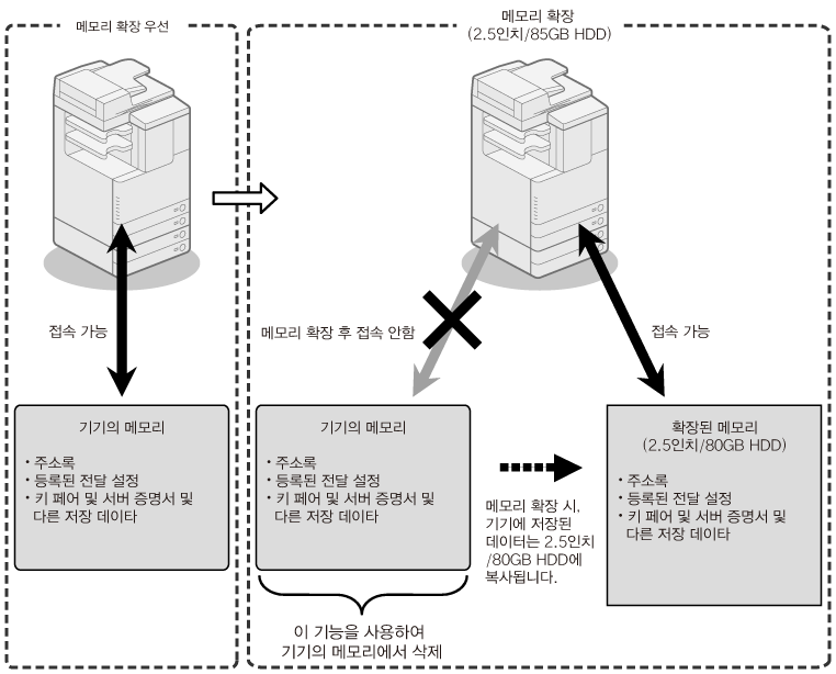2.5인치/80GB HDD를 사용하여 기기의 메모리 용량을 확장할 수 있습니다. 메모리를 확장할 경우 기기에 저장된 데이터가 2.5인치/80GB HDD로 복사됩니다. 이 경우, 기기에 남아 있는 데이터에 액세스할 수 없게 됩니다. 이 기능을 사용하여 기기에서 이전 데이터를 삭제하는 것이 좋습니다.