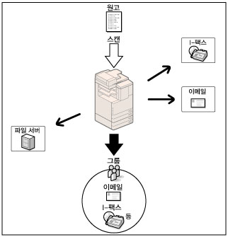스캔한 문서를 이메일 주소, I-팩스 주소 또는 파일 서버로 송신하려면 네트워크 설정을 지정해야 합니다. (See "이메일/I-팩스 공통 통신 설정.")