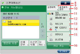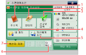 팩스 수신인을 표시하려면 [팩스기능 표시]에 대해 <<스캔하여 송신>에 팩스 표시>를 '설정'으로 지정합니다. (See "팩스 기능 표시.")