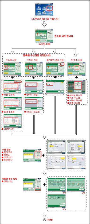 수신인, 스캔 설정 및 송신 설정 등 최근 세 가지 송신 작업을 불러옵니다.
