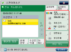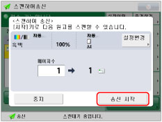상황확인/중지 화면에서 송신 작업을 취소할 수도 있습니다. (See "송신이거나 송신 대기 중인 작업 취소.").