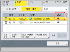 [상황확인/중지] → [송신] → [작업 이력]에서 문서의 배달 상태를 확인할 수 있습니다. 문서가 성공적으로 수신되었으면 [OK]가 표시되며, 송신되지 않으면 [NG]가 표시되고, 결과를 확인할 수 없으면 <-->가 표시됩니다. Simple 모드에서는 배달 확인이 불가능합니다. 성공적으로 배달되었어도 <-->가 표시됩니다.