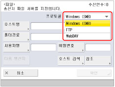 imagePASS가 장착된 다른 imageRUNNER ADVANCE 기기의 고급 박스에 파일을 저장하려면 [WebDAV]를 선택합니다. (Windows (SMB)는 사용할 수 없습니다.)