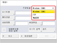 imagePASS가 장착된 다른 imageRUNNER ADVANCE 기기의 고급 박스에 파일을 저장하려면 [WebDAV]를 선택합니다. (Windows (SMB)는 사용할 수 없습니다.)