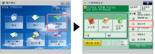 [스캔하여 송신]을 누르고 → 수신인을 지정한 후 → 스캔 크기 버튼을 누릅니다.